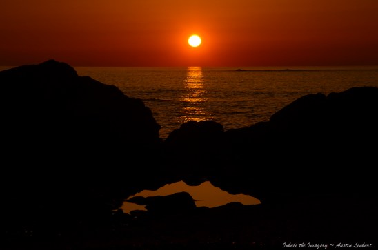 DAY 118 of SP… On a rocky knoll of Minot Beach when a very still tide-pool caught my eye… I wanted to catch it but the light was getting more intense.. so to accent the tide-pool with the rising sun in full frame, I needed to adjust the exposure to blacken out ocean rock. But I also wanted to catch the depth of the Atlantic, the orange color of sky horizon, and not blur out wave… Adjust… Focus… and let the camera go..