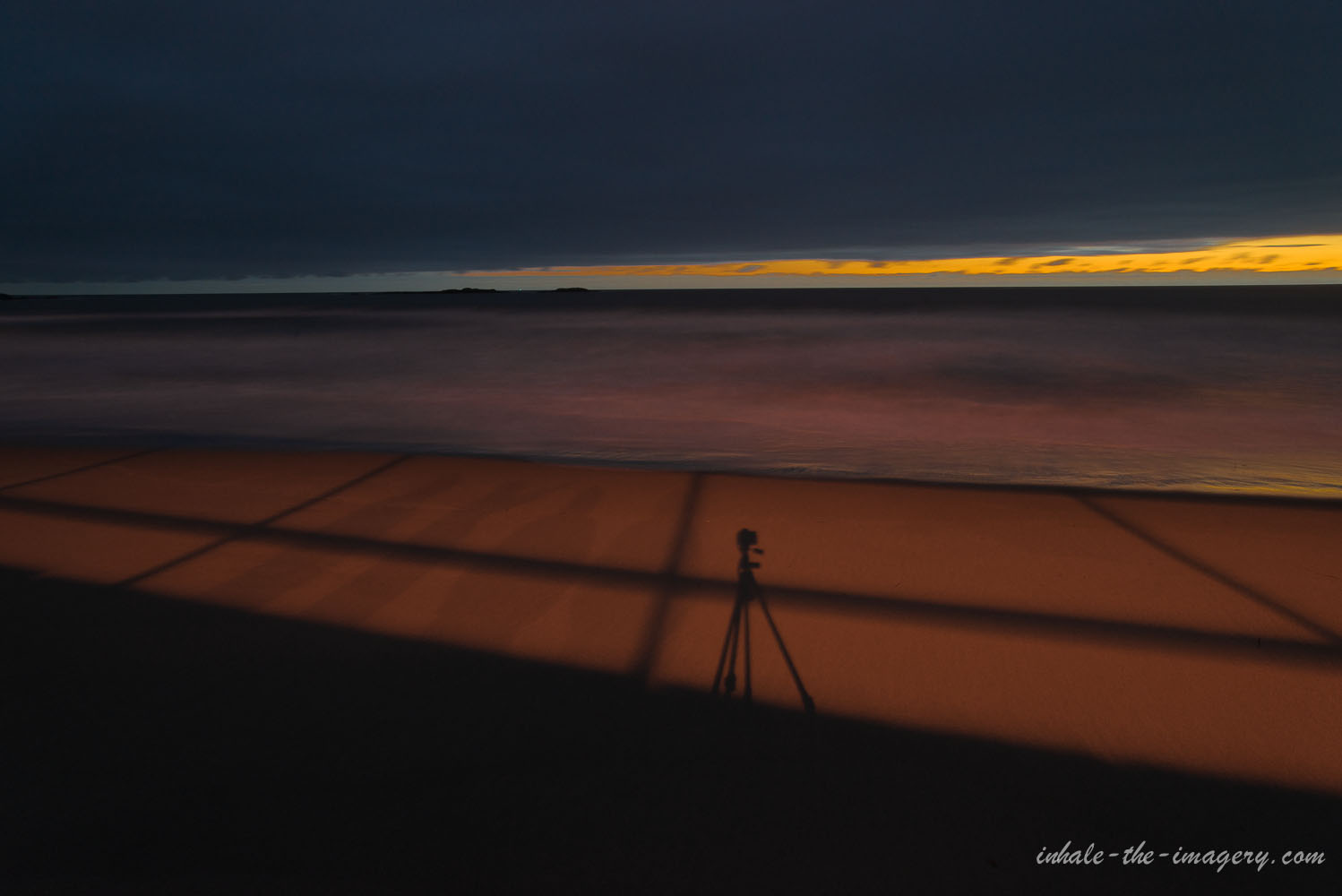 DAY 60 of SP… WHAT IS THAT THIRD SHADOW POINTING AT? AND WAY TOO MANY CALCULATIONS ON THIS SHOT…for the past month I have noticed at certain times the shadows cast by street light lay a grid on Minot Beach; an array with 2 rows and many columns; as columns vanish beyond street light cast. Also the horizontal grid-lines follow the surf line but only at a specific time in the tide-cycle..and I wanted to shoot it π .. So the trick was to get the top grid line to edge up with surf-line and not let surf line pass it for 30″ (time of shutter speed).. Well that happened to be at 5:33 am this morning.. If not today, next opportune time would be around 29 days from now….. So I set up camera on lower grid line shadow, between surf line and railing, waited and shot.. For kicks I then moved every 5″ to the left of the camera so my shadow is cast 4 times (20 seconds of being static, 10 seconds in movement), giving the appearance that there was more than one person watching the sunrise.. My 3rd shadow is pointing in the direction of the sunrise.. Yep, too many numbers and timed hoops to jump through on this shot but it made for a fun and well planned Event