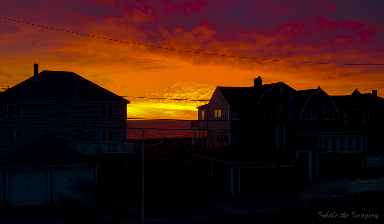 Day 84 of SP… It was a stunning sunrise but was also cookin’ up a fine breakfast for the kids, being MCAS (exams) and all today, so enjoyed the sunrise from the front balcony this morning … A BKT shot of 7 exposures so as to catch the sunrise but also allow me to under expose foreground to black out homes … Nature can put on quite a light show when she wants….